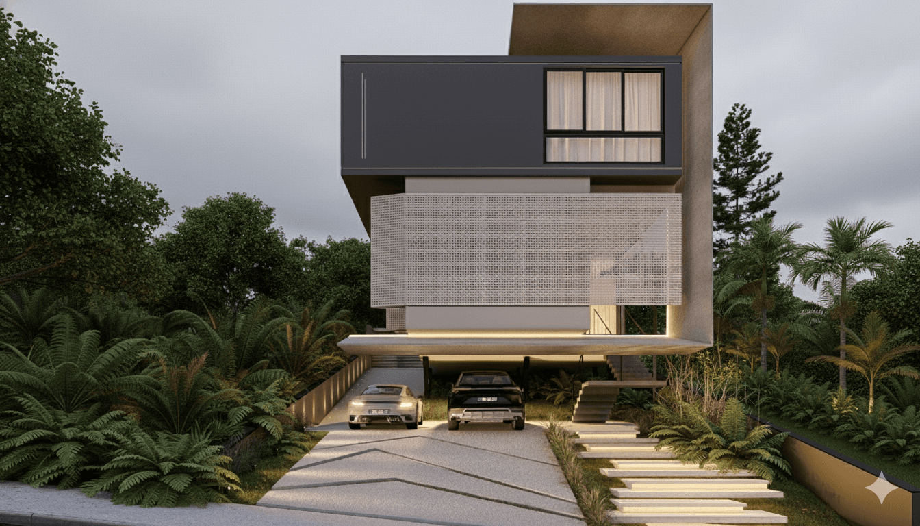 A implantação em terreno com aclive foi resolvida com a garagem posicionada no pavimento térreo, garantindo acesso nivelado e maior comodidade para os moradores. A residência ainda conta com uma suíte no mesmo pavimento, favorecendo a acessibilidade e ampliando o leque de usos para diferentes perfis familiares. O conceito privilegia a integração dos espaços sociais, com ambientes amplos e conectados que dialogam com a topografia e com a luz natural. A fachada imponente, com volumes bem definidos e elementos vazados, confere identidade e contemporaneidade ao conjunto, sem abrir mão da funcionalidade.
