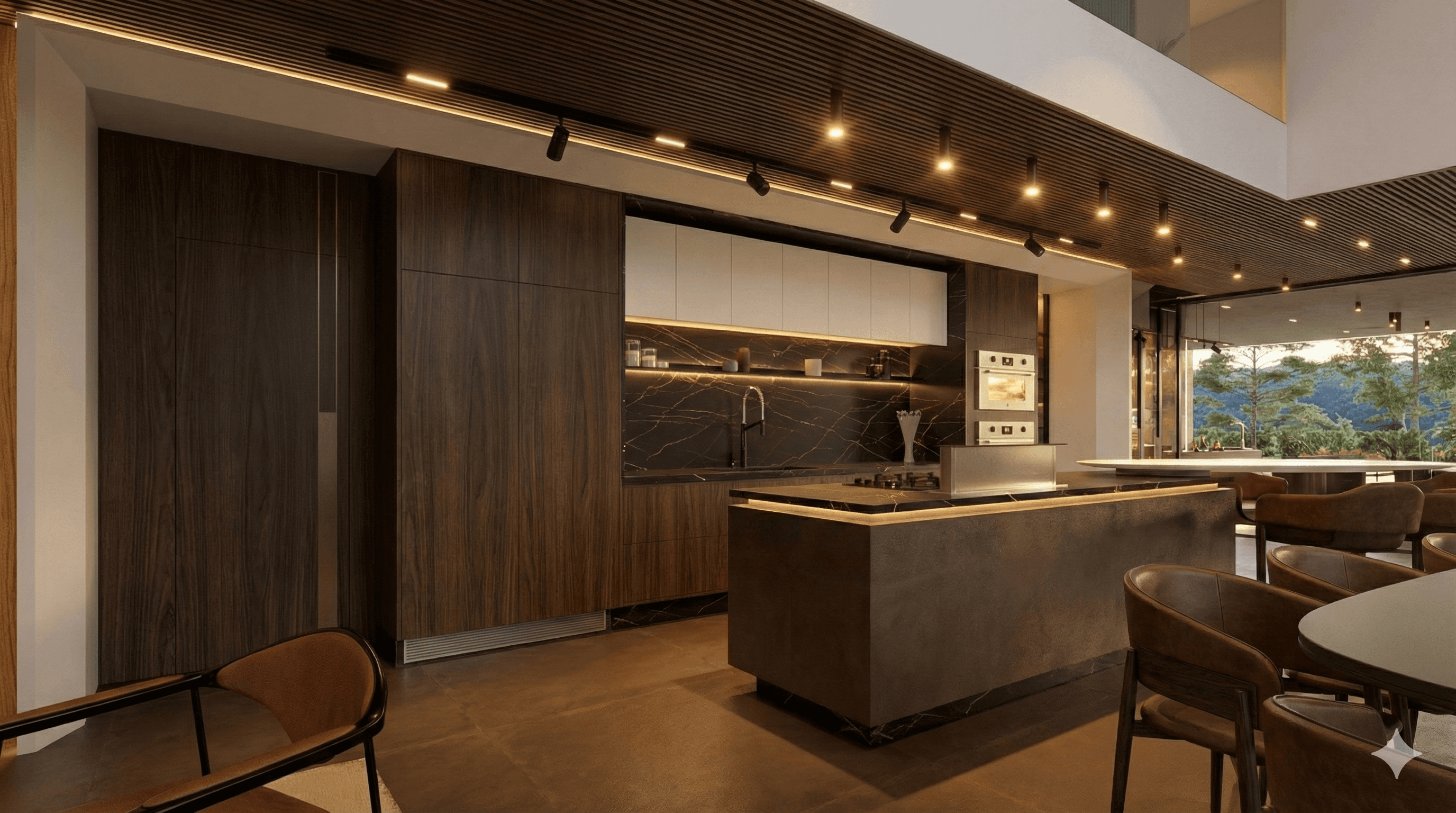 Com atmosfera contemporânea, o projeto se destaca pelo uso de materiais nobres, marcenaria sob medida e uma paleta que valoriza tons marcantes e neutros, contrapondo presença e suavidade. A integração entre os ambientes sociais e a generosa entrada de luz natural reforçam a sensação de amplitude e conforto. Cada escolha – da iluminação aos acabamentos – foi pensada para transmitir sofisticação com discrição, mantendo o foco na funcionalidade e na experiência sensorial de quem habita o espaço.